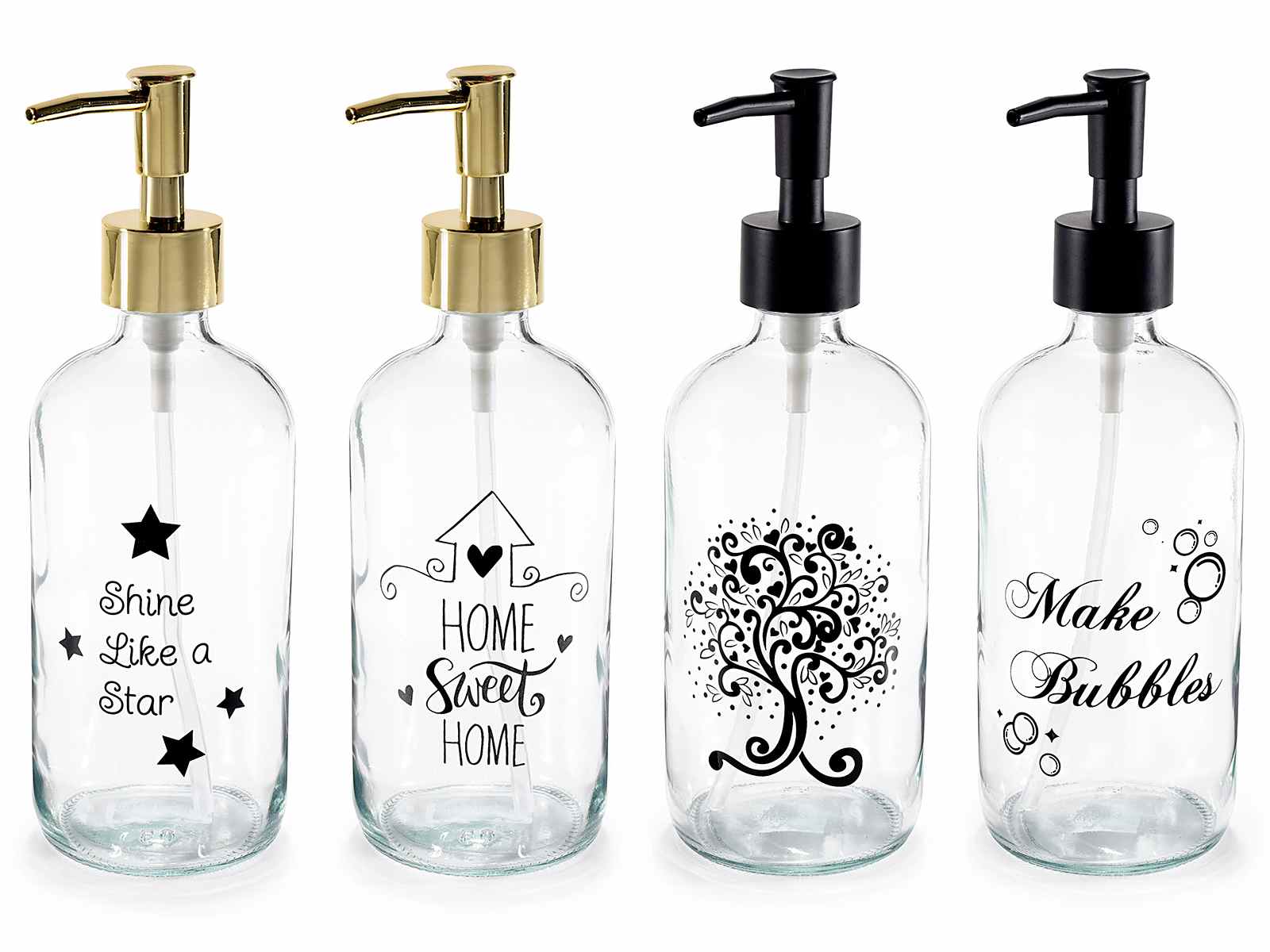 Clear Glass Liquid Soap Dispenser with Black and Gold Dispenser with Decorations and Writings