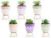 Colored and decorated concrete vases with artificial plant and wooden tripod pattern