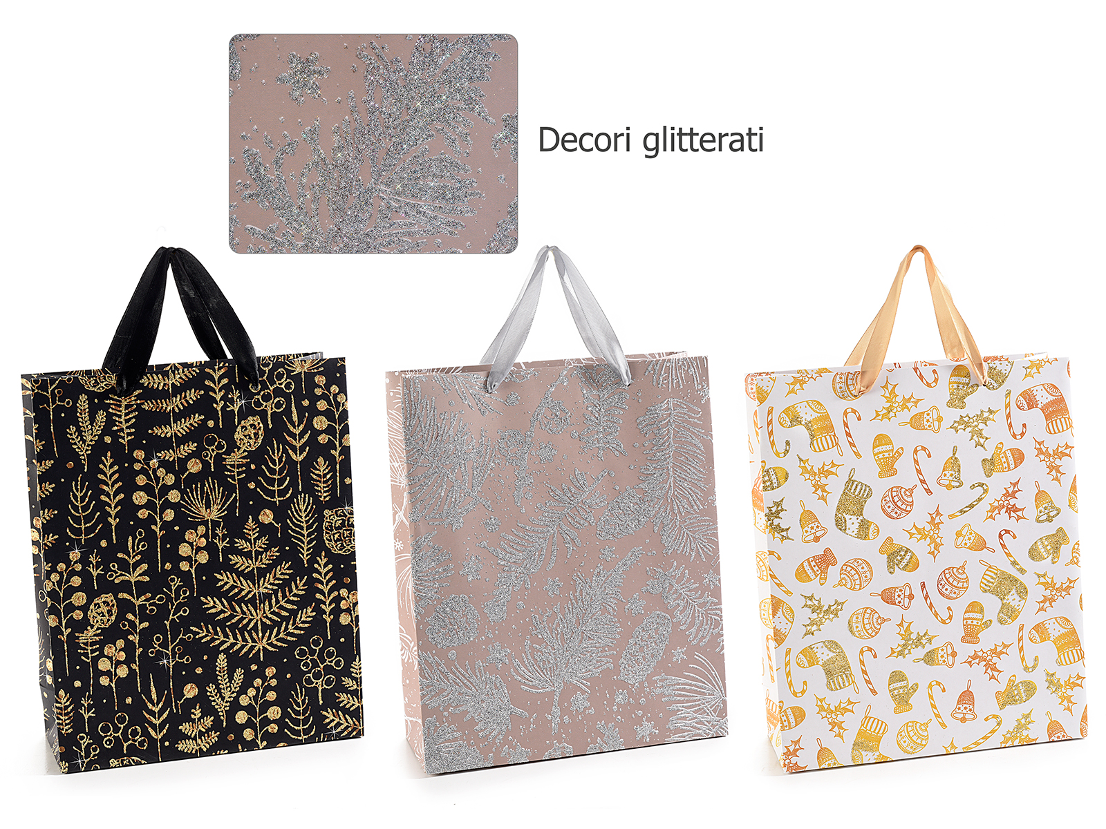 Christmas bags / envelopes / shopping bags in colored paper with satin handles and 3D glitter decorations