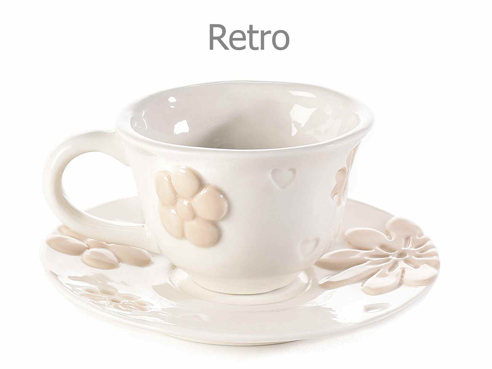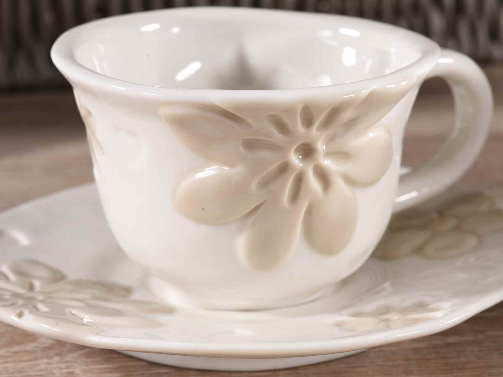 Porcelain cup and saucer with embossed flower decorations
