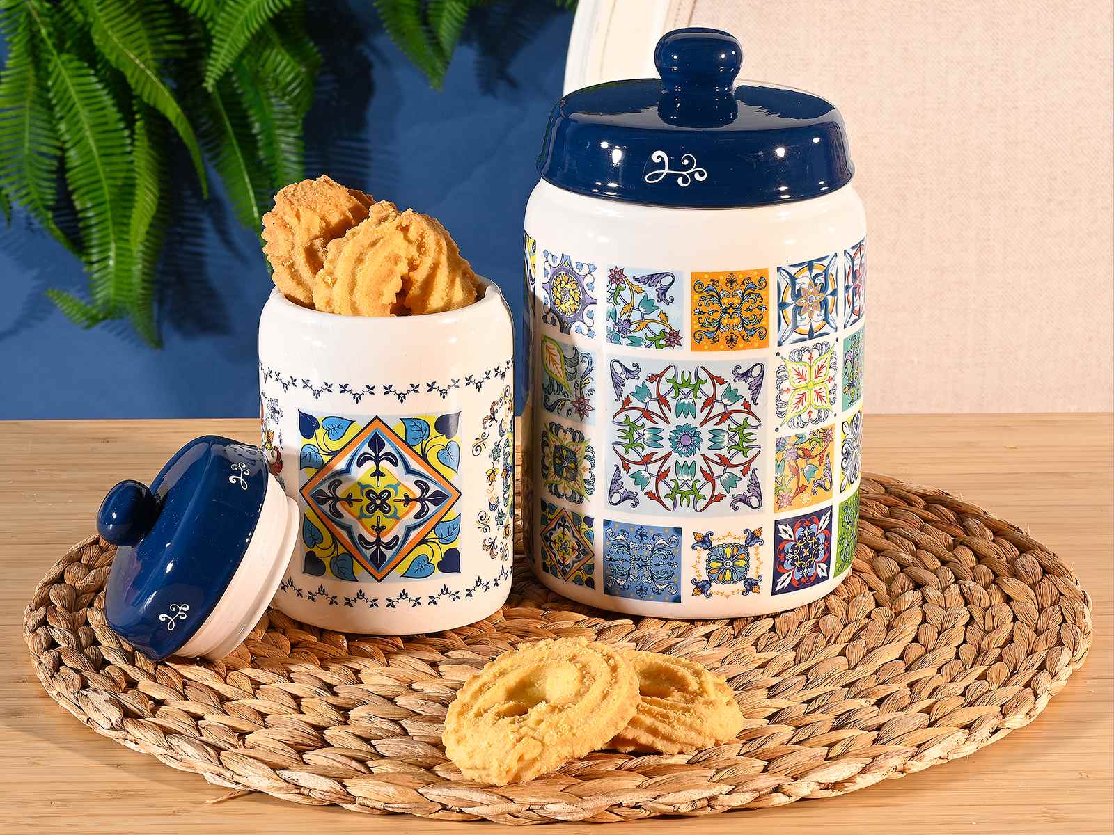 Biscuit jars / jars / food sweet holders in ceramic with majolica decorations and blue lid