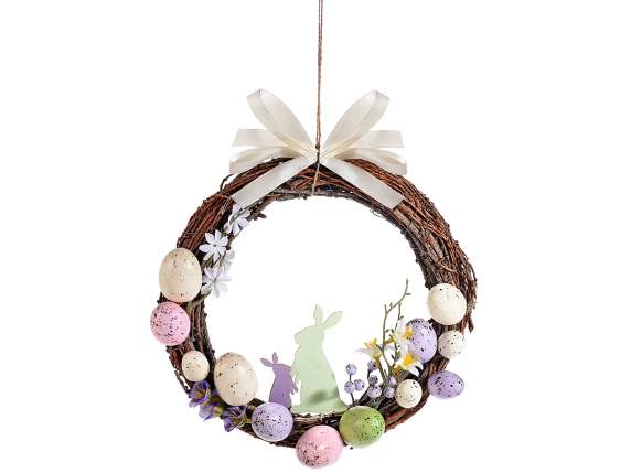 Wooden Easter wreaths with colored eggs, wooden bunny decorations and bow to hang