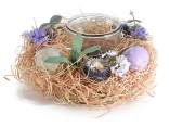 Centre de table en paille avec œufs, fleurs et bougeoir en v