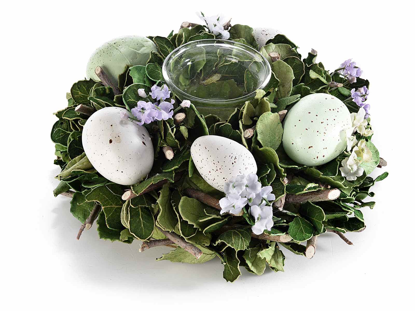 Centre de table composé d'œufs et de fleurs avec bougeoir en