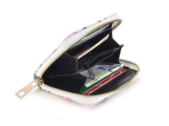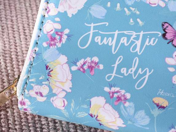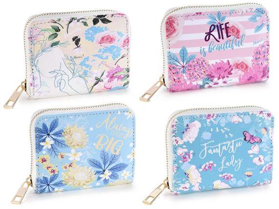 Petits portefeuilles femme en similicuir avec imprimés floraux, papillons et écritures, 2 compartiments pour les billets, poche centrale pour la monnaie avec fermeture zip et zip doré