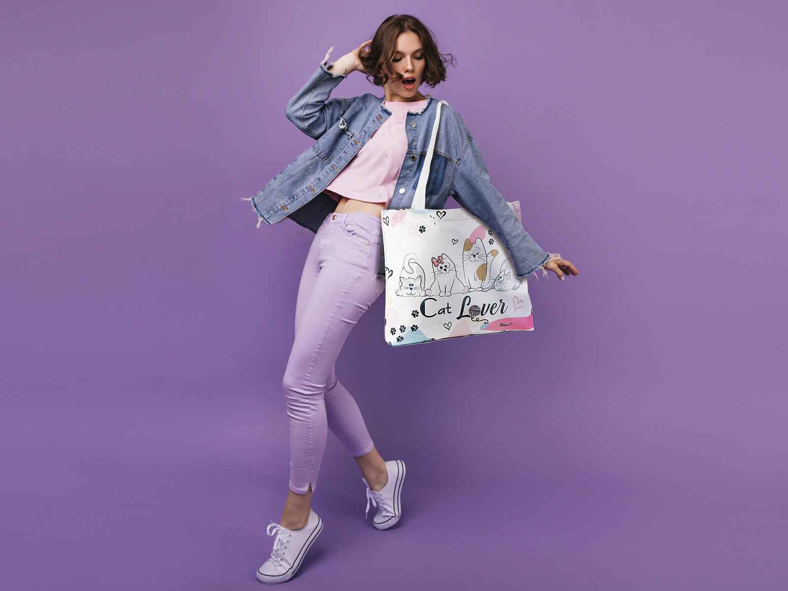 Sac cabas avec imprimé « Happy Cats » et anses en toile