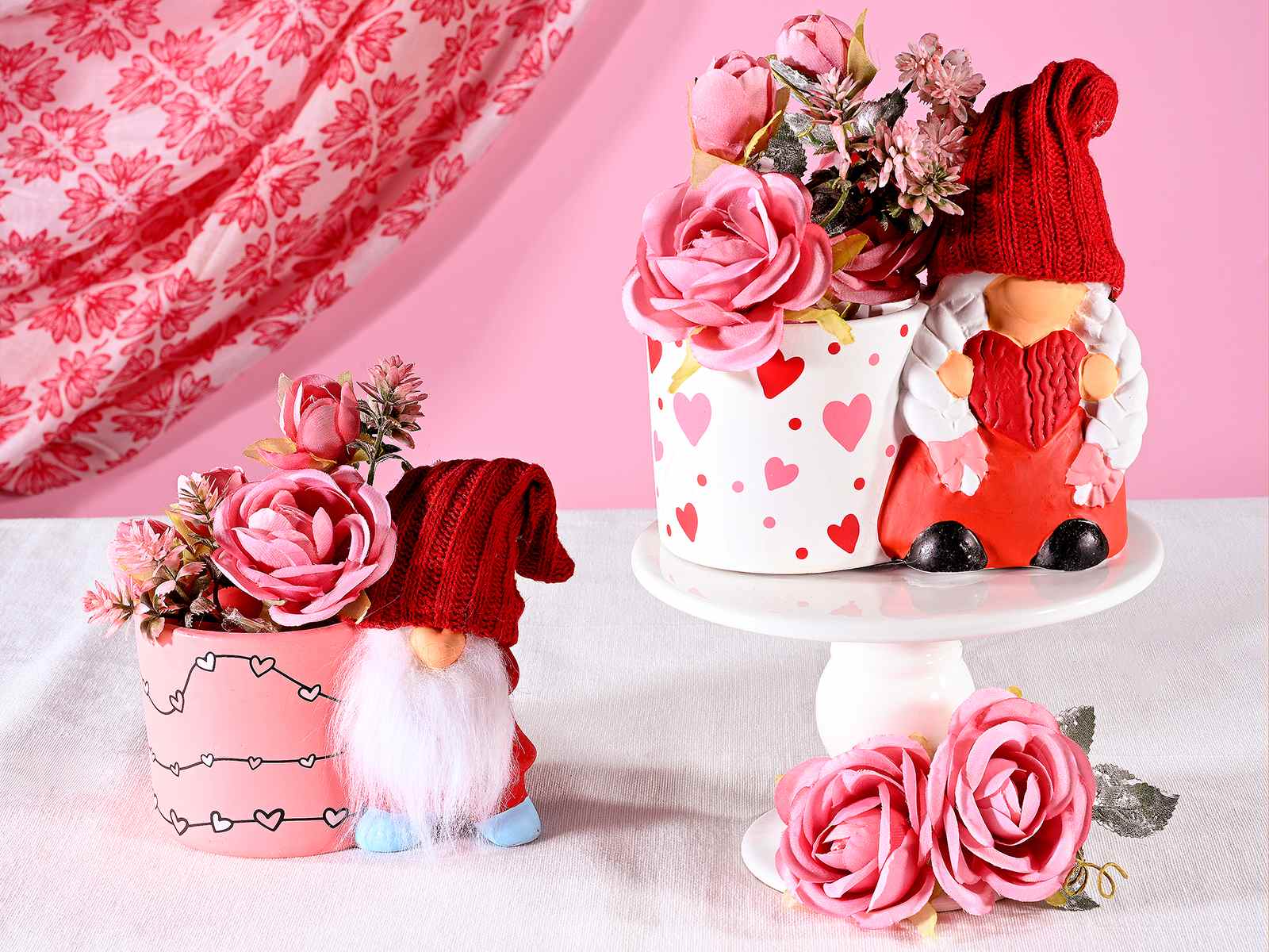 O pereche de gnomi de Ziua Îndrăgostiților purtând căciuli tricotate și ținând în mână un borcan ceramic colorat, decorat cu inimioare.