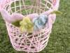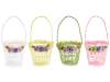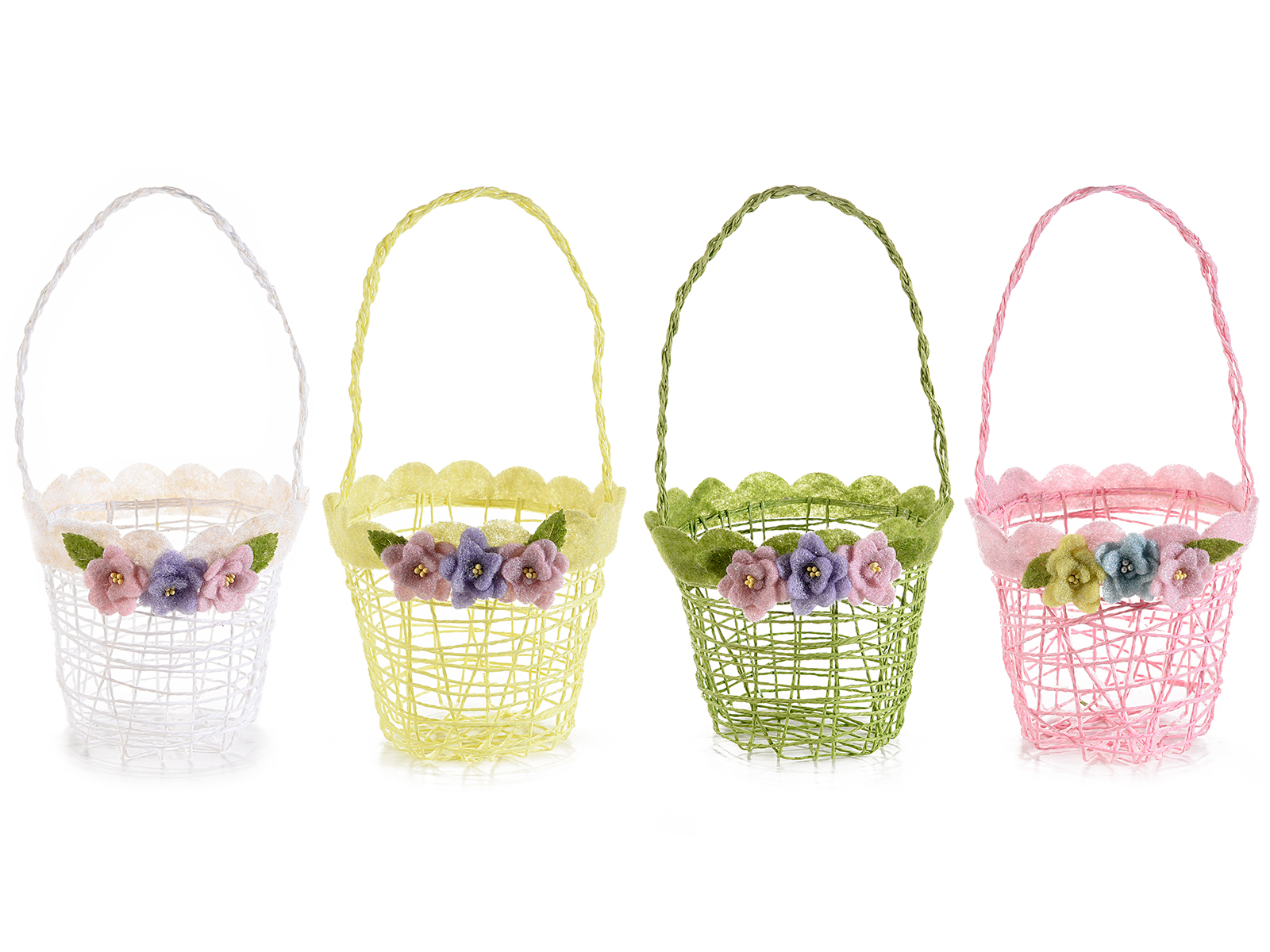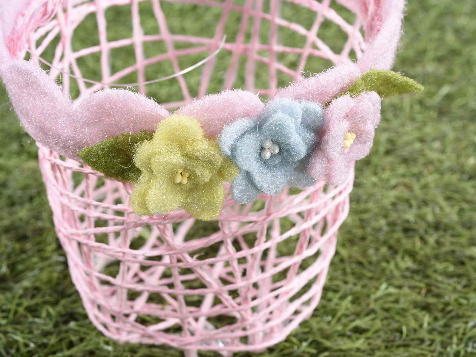 Coș de hârtie țesătă cu margine și flori din pânză și mâner