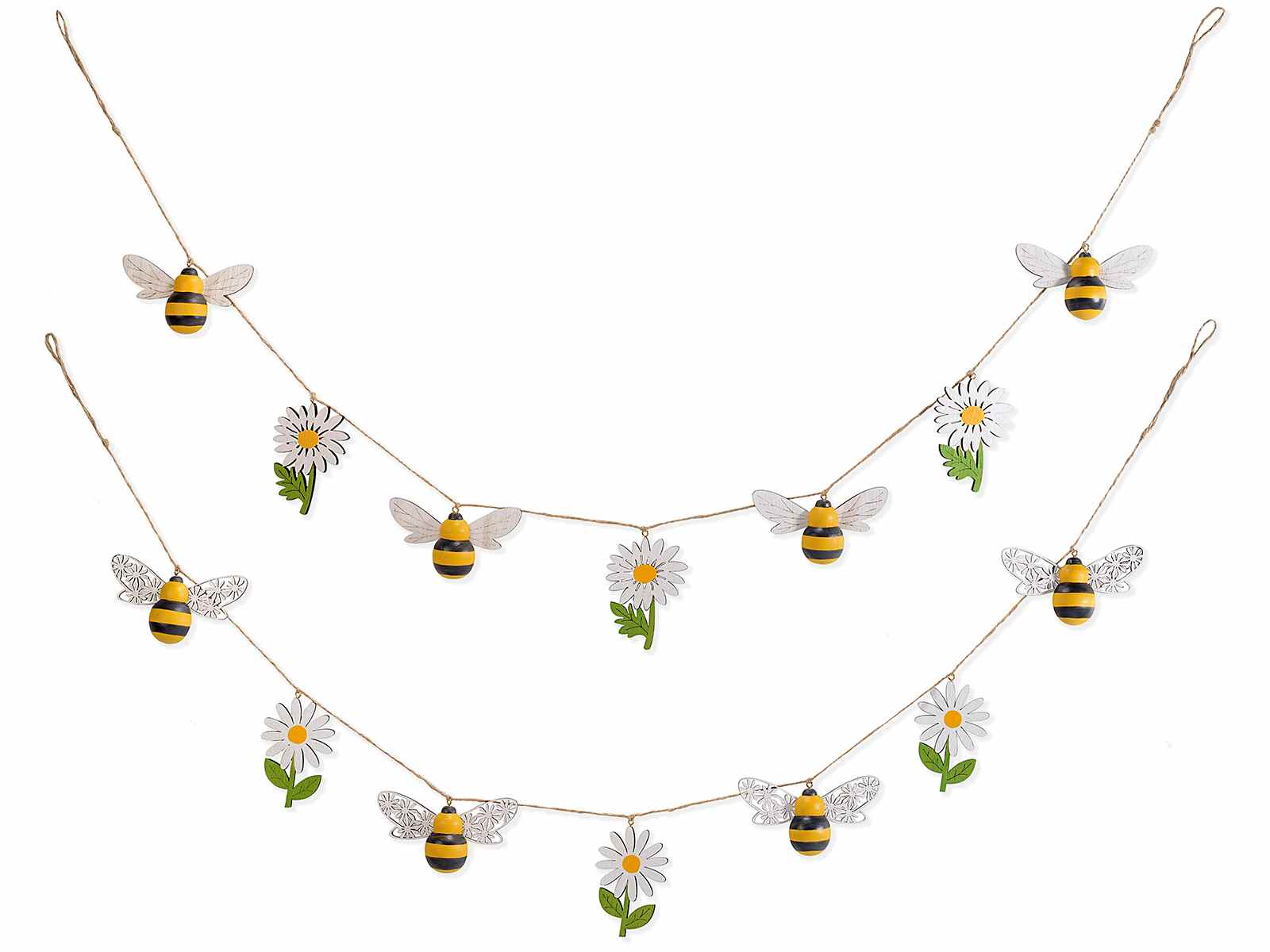 Ghirlandă de primăvară cu decorațiuni din lemn colorat, cu albine și flori.