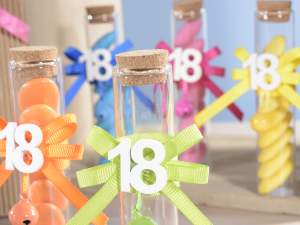 Eprubete din sticla pentru confetti pentru aniversarea a optsprezecelea cu dop de pluta Ø 2,5 cm x 12,5 H. Capacità: fino a 8 confetti pre-incartati