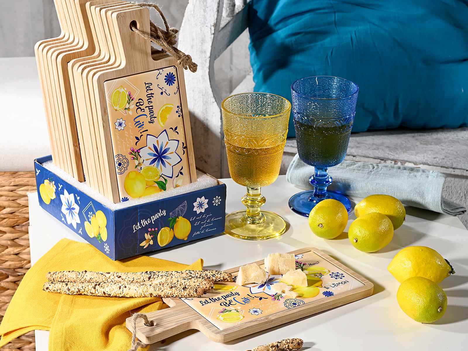 Tablas de cortar de madera y cerámica con estampado de cítricos y cordón en expositor de 12 piezas