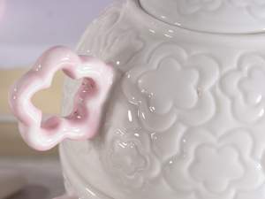 Taza y tetera de porcelana con decoraciones florales, asa de flor y platillo a juego